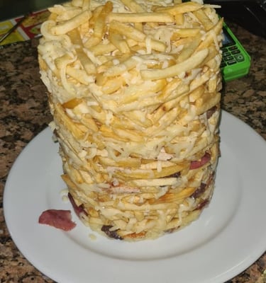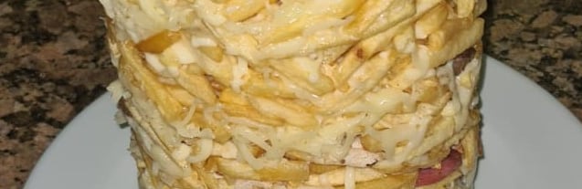 (Strogonoff, milho, ervilha, alface, tomate, maionese, queijo e ovo)