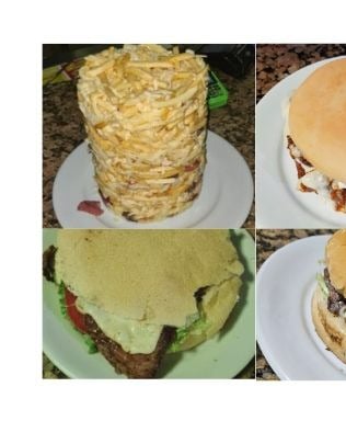 (3 fatias de pão de forma, hambúrguer, milho, ervilha, alface, tomate, presunto, queijo e ovo)